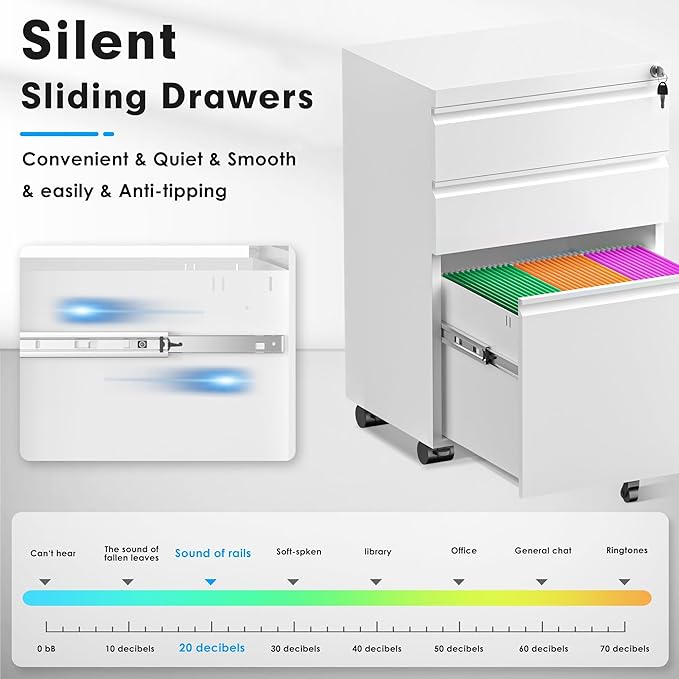 - 【Locked File Cabinet】: The newly upgraded locking mechanism not only allows 3 drawer mobile file cabinet to be locked by one lock but also allows all drawers to be opened at the same time, saving the trouble and time of opening drawers one by one. Safely keep your files and important stuff private