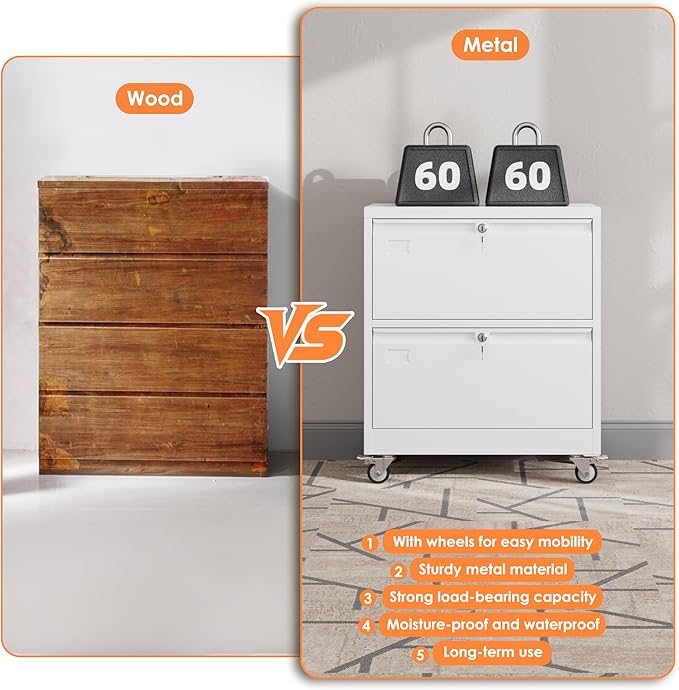 - 【High Quality Construction】The file cabinet with wheels is made of heavy duty steel material, and the surface with powder coating is very smooth, which can avoid rust. Due to their metal surface, metal storage cabinets are easy to clean and maintain.The wheels can be locked, placed fixedly or moved freely