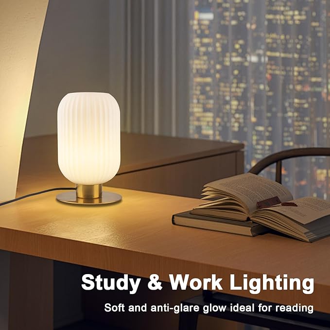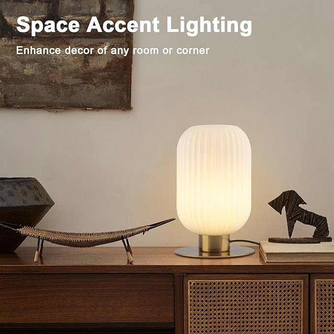 - 【Mid Century Modern Style】This white glass table lamp features an iconic shape which brings structure, texture, and a warm glow to your bedroom, living room, entryway, or office. The milky white glass globe is softly textured with embossed horizontal lines With satin brass accents, this mid century modern table lamp combines elegance and functionality.