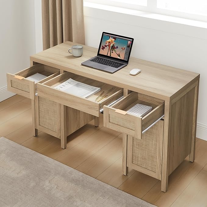 SICOTAS Rattan Executive Desk with Storage - Larger Home Office Desk with Drawers and Cabinets, Farmhouse Boho Computer Table Vanity Desk for Study, Office, Living Room, Light Oak (2 Pieces)