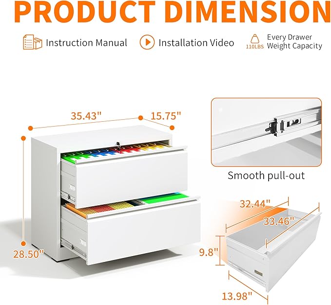 - 【Ample Storage Capacity】 This lateral file cabinet boasts a total size of H28.5"×W35.4"×D15.7", while the interior size of each drawer is H9.8"xW32.4"xD14". With three drawers and an adjustable hanging rail inside, it provides more than enough space to effortlessly hang Legal/Letter/A4 files or store your various belongings.