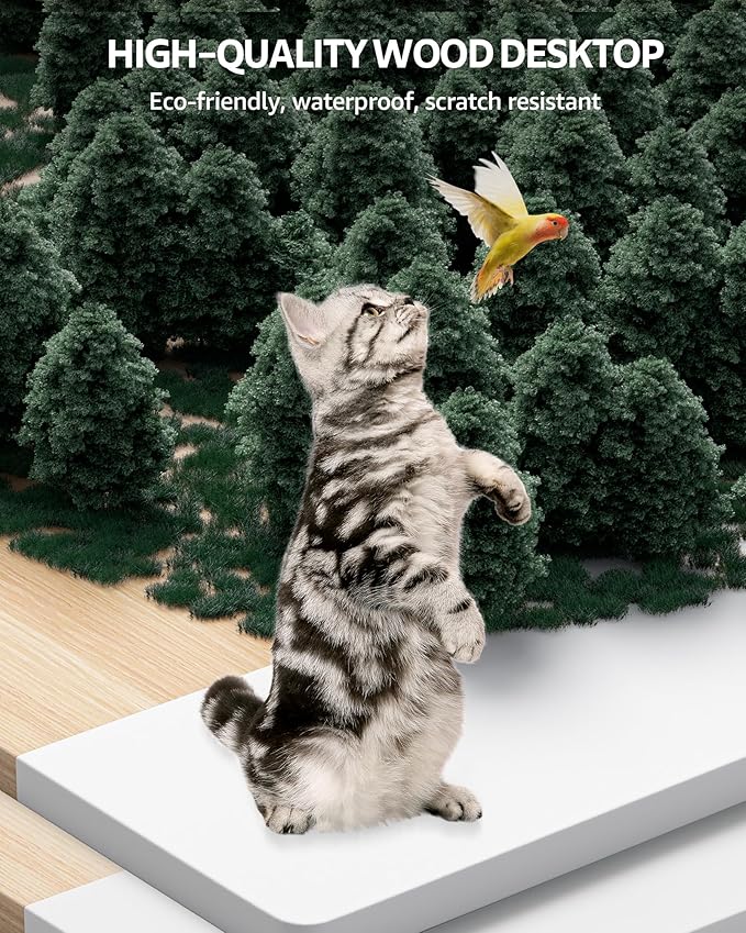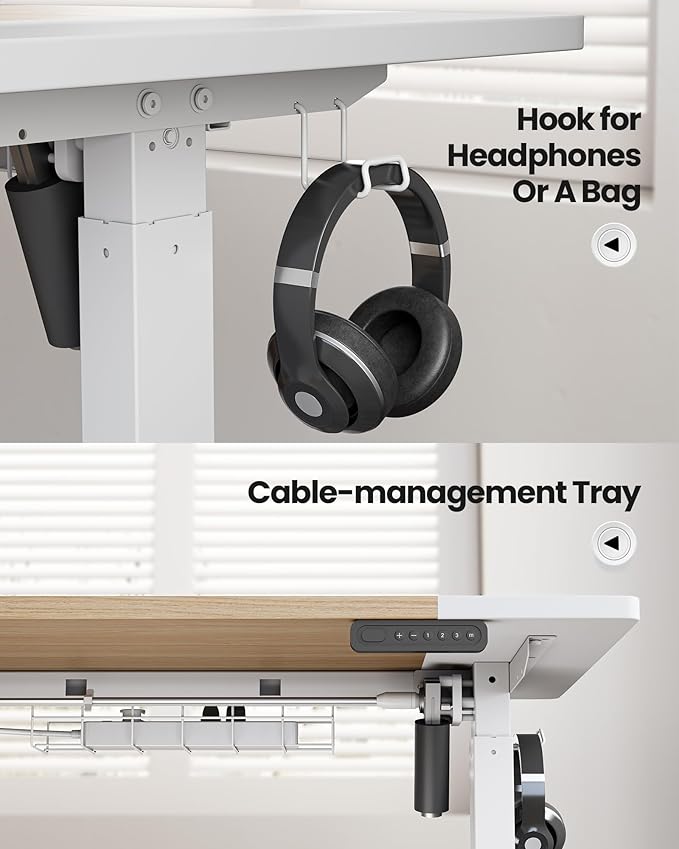 - Organize Your Workstation : 48"x24" eco-friendly desktop provides you with a spacious workspace. (The 40-inch version is a whole-piece) Integrated cable management tray and hooks for headphones or bags, ensuring a tidy workspace. Say goodbye to cable chaos and focus on what matters!