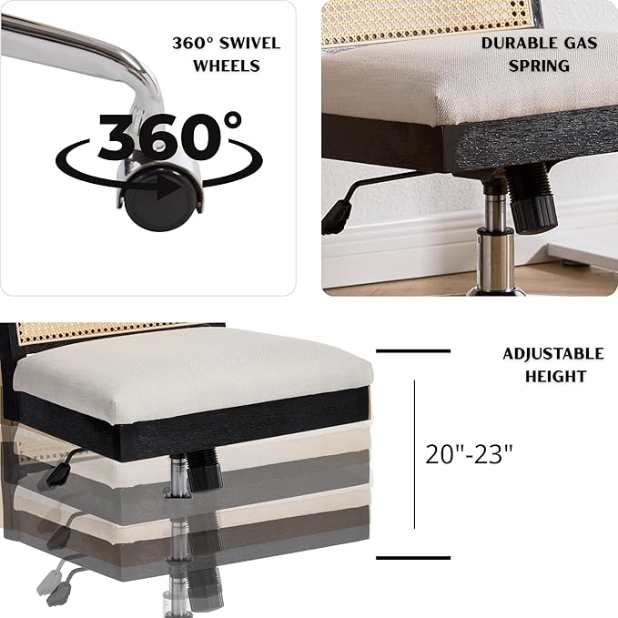 Rattan Desk Chair Linen Fabric Upholstered Computer Office Chair, 360° Swivel Work Chair with Wheels Comfortable Armless Chair for Home Office Study Studio, Beige