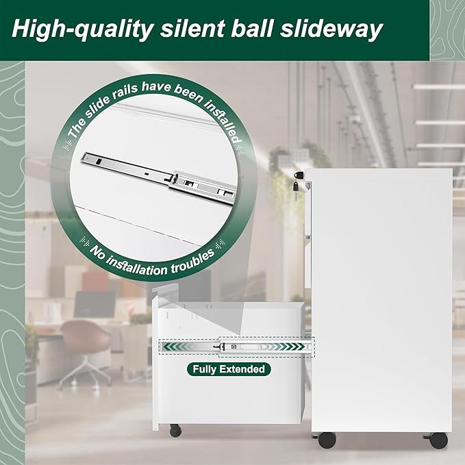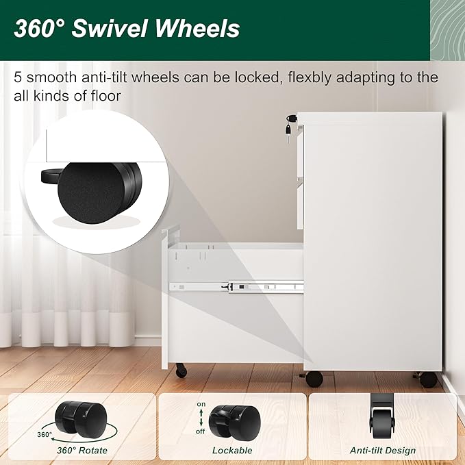 - ❤All for Improving Office Productivity -- Overall size:14.9" W×17.32"D×23.8"H, perfect size make the white file cabinet can be put under desk or side table or small spaces to save space, 5 smooth anti-tilt casters can be rotated 360°and locked, flexibly adapting to the all kinds of office floor. 1 stationery tray is included, you can use it to organize small office supplies. Unique pull-out handles are easy to grab. All for improving office productivity and efficiency!