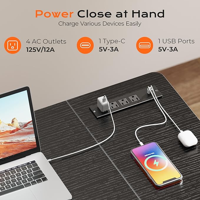 - 【Power Outlets】Stay powered through long work sessions or late-night gaming. With 4 AC outlets, 2 USB ports, and 1 Type-C port built right into the desk, you can charge monitors, laptops, consoles, and all your everyday devices without reaching for a wall socket