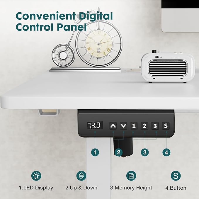 - 【3 Preset Electric Height Adjustment】The electric desk adjustable height has 3 preset buttons, customizing heights from 28.3" to 46.5". No manual effort—this electric desk lets you switch heights quickly, ideal for different sitting/standing postures.
