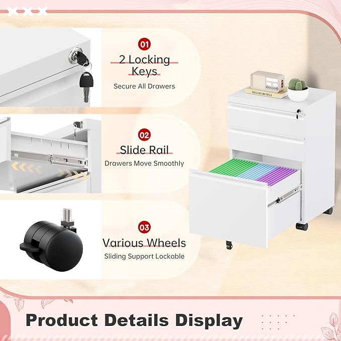 - ❤Lockable Mobile File Cabinet: 3 Drawer filing cabinet Instructions are supplied from the factory. You just need to follow the process of the manual to install it. The installation process is simple and can exercise hands-on ability. 1 lock secures all the three drawers.Tips: 2 keys should be kept separately in case of losing.