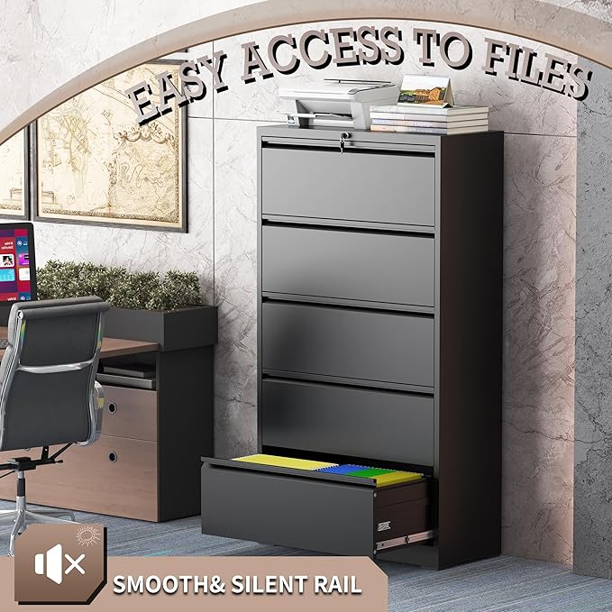 - 【Premium Steel Material】The 5 drawer lateral file cabinet constructed from sturdy cold-rolled steel and with a powder coating process. This filing cabinet offers perfect strength and durability. It reliably protects your important files from damage and is built to withstand daily use for several years to come.