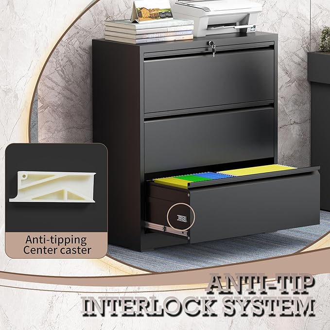 - 【Enhanced Stability and Safety】Our lateral filing cabinet features an anti-tip interlocking system that allows only one open able drawer at a time, preventing multiple drawers from opening at the same time, maintaining balance and preventing accidental tipping. This is especially important for homes with children or in busy offices.