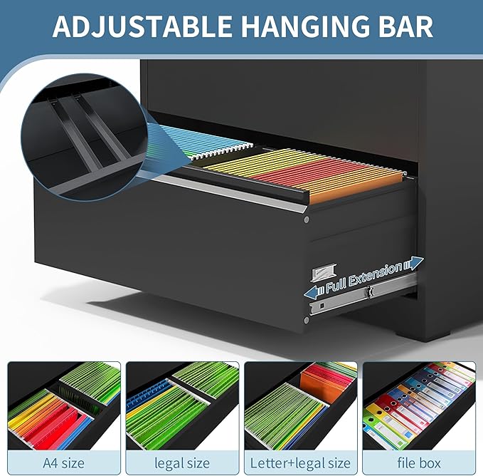 - 【High Quality】: Lateral file cabinet with lock is made of thick high-strength cold-rolled solid all-steel material.Powder-coated construction making the heavy duty file cabinet immune to corrosion and rust which is very durable and stable for your daily use at home and office.Due to the metal surface, metal storage cabinets are easy to clean and maintain. The filing cabinet only require a damp cloth or cleaning agent to wipe them down.