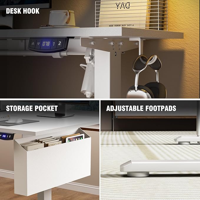 - Spacious Organized Workspace: This electric standing desk is engineered for spacious comfort and superior organization, featuring a 15.7inch L-shaped deep desktop that provides ample room for multiple monitors and work essentials. With an integrated side pocket and hook, it effortlessly keeps cables and supplies neatly stored. Built with a sturdy particle board top and robust steel frame, the desk supports up to 180 lbs, delivering the stability and durability required for focused and efficient work.